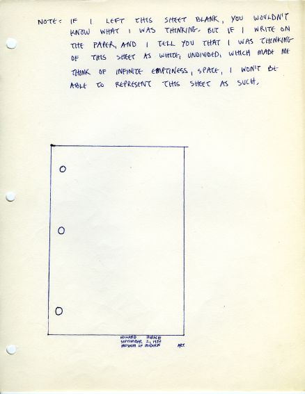 Context #7, 1970. 7 black notebooks with pages, ink, graphite, crayon, postage stamps, photograph, sugar package on paper. Each 11.75 x 11 x 3” each, (29.84 x 27,94 cm each). #70008. Detail: Note: If I Left This Sheet Blank. Collection Walker Art Center. © Adrian Piper Research Archive Foundation Berlin.