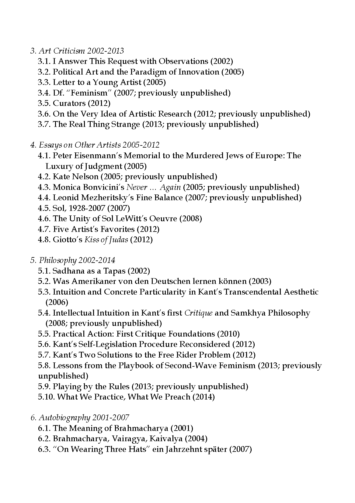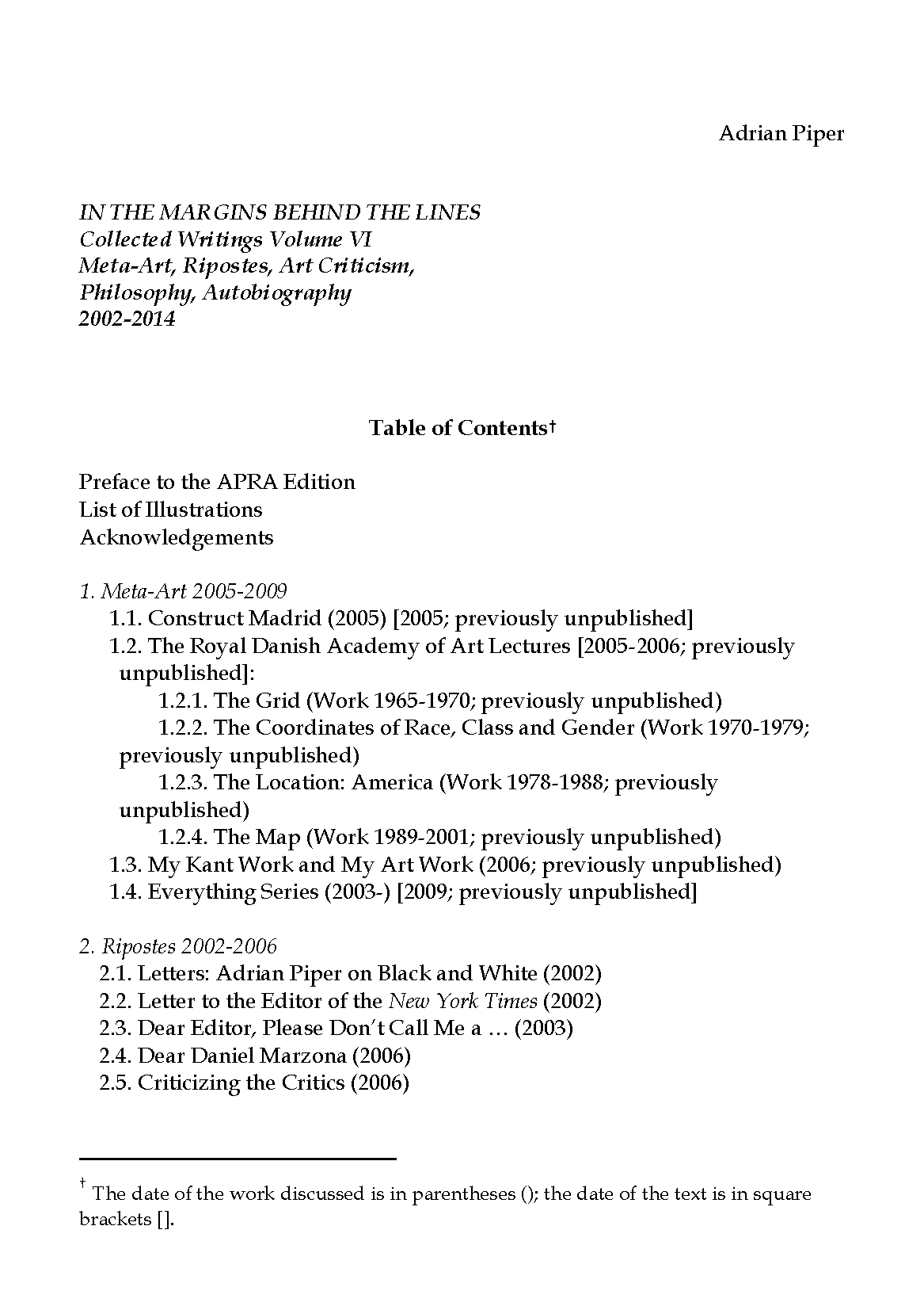 These writings span the period immediately preceding and subsequent to Piper’s emigration to Germany in 2005. Earlier texts focus on political and spiritual strategies of self-defense in the art world and in her personal life, whereas later ones pursue her in-depth analysis of Kant’s texts, her investigation of the deep self in her artwork, and her attention to the work of other artists. Ripostes to art critics extend and explore more deeply the critical reception of her own artwork in the US, as well as the complex, institutionally inflected relationship between artists and critics in general. Forthcoming